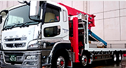 吊り上げ荷重が4.9tまで対応しており、また最大積載量8,800kgあるので折り畳んだハウスを一度に複数棟運搬するのに適しています。(弊社自社車輌)